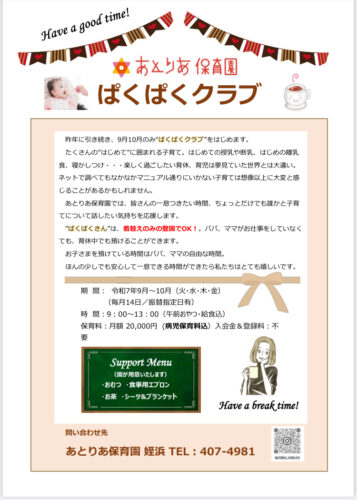 0歳児さんを対象に、着替えのみで登園OKの ぱくぱくクラブ が始まります!